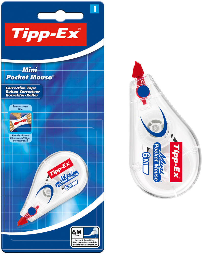 Nebojte se, mocná kapesní myš Tipp-Ex Mini je tu, aby opravila Vaše chyby. Okamžité opravy bez nutnosti schnutí, stačí ihned psát. Toto balení obsahuje 1 korekční pásku Mini Pocket Mouse až s 6m pásky. Pokud se páska někdy natáhne, jednoduše ji bleskově naviňte. Hladké a rovnoměrné korekce jsou hračkou s touto superpevnou plastovou páskou.